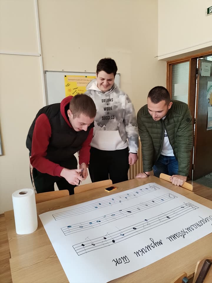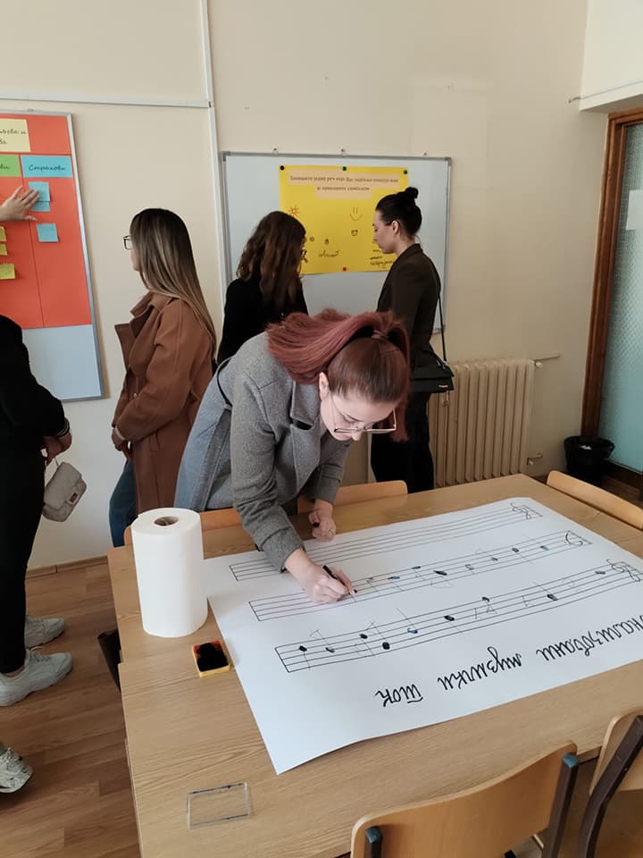 • студенти су имали могућност да оставе свој траг на линијском систему правећи Персонални музички ток, који може и да се отпева или одсвира, а потом кроз игру да мењају исти са задацима:Како звучим и колико трајем ако ми нацрташ врат? Како звучим и колико трајем ако ми нацрташ ноге? Како звучим и колико трајем ако добијем заставу/ве? Како сада звучим када се попнем две степенице горе/доле? Како бих звучао када би уз ову музику марширао, а како када бих плесао валцер? Кроз игру студенти су изводили и запажали како се мењао музички ток када су се мењала трајања тонова, тонске висине и музички метар.
